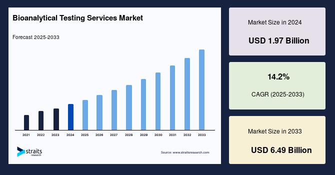According to StraitsResearch, the global bioanalytical testing services market size was valued at USD 1.97 billion in 2024 and is estimated to reach USD 6.49 billion by 2033, growing at a CAGR of 14.2% during 2025-2033.