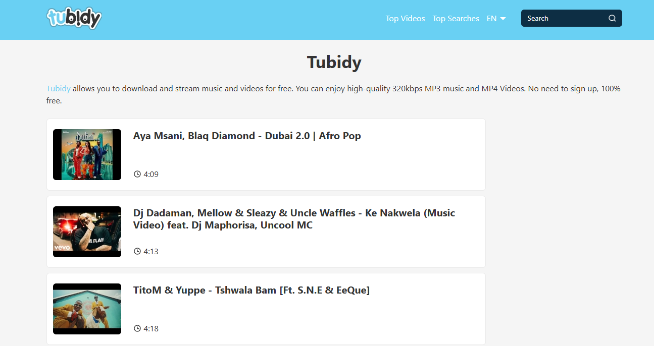 Tubidy provides audio and video files in decent quality, giving you a smooth listening and viewing experience.