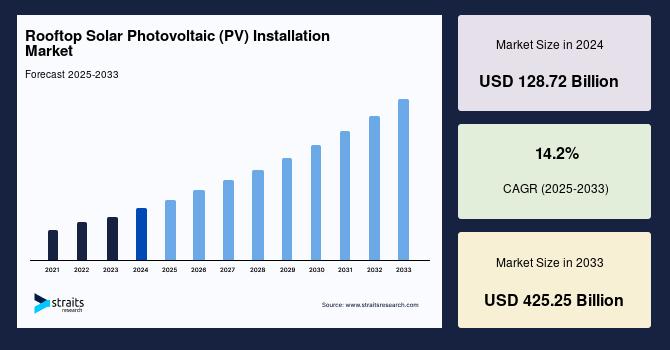According to StraitsResearch, the global rooftop solar photovoltaic installation market size is valued at USD 128.72 billion in 2024 and is estimated to reach USD 425.25 billion by 2033, growing at a CAGR of 14.2% during 2025-2033.